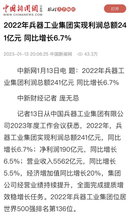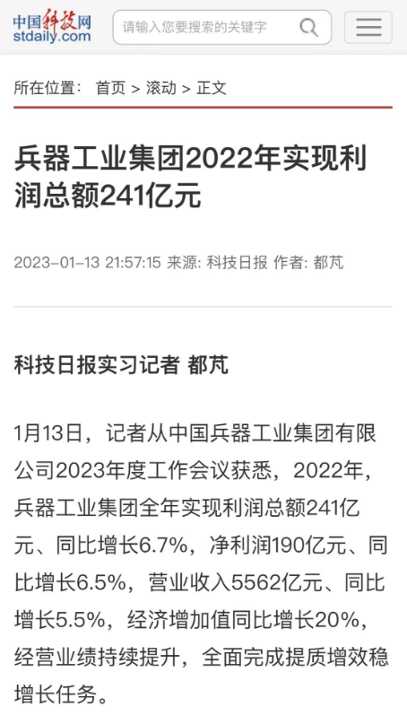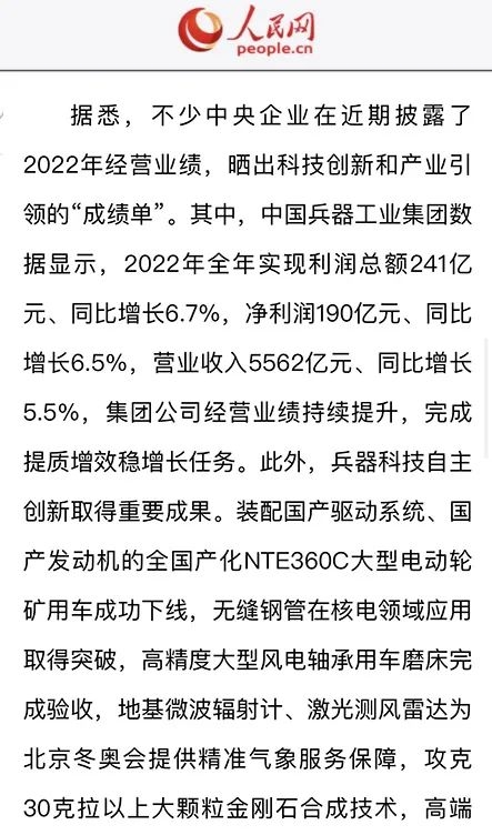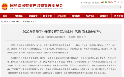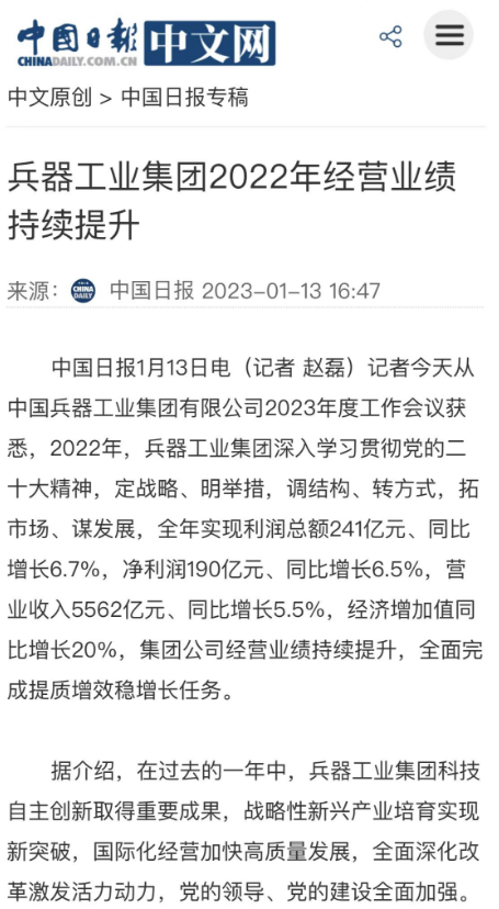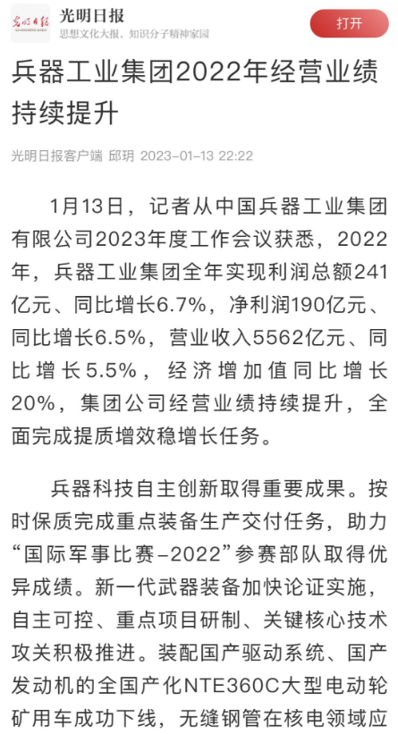 1月13日,中國兵器工業(yè)集團有限公司召開2023年度工作會議,傳達學習中央領導同志、軍方首長和上級部門重要批示,總結集團公司2022年工作,研究部署2023年主要工作任務。 集團公司2022年重點工作取得的成績及下一步的改革發(fā)展受到社會媒體廣泛關注。新華社、新華財經、人民網、經濟日報客戶端、光明日報客戶端、中國日報網、中國科技網、中國新聞網、央廣網、國資委網站、學習強國中央企業(yè)學習平臺、新浪網、騰訊網、搜狐網、網易網、今日頭條等中央主流媒體、國家部委網站及知名網絡媒體對集團公司工作會議進行了報道,重點關注集團公司高質量發(fā)展、科技創(chuàng)新、戰(zhàn)略性新興產業(yè)培育、深化改革、國際化經營、履行央企社會責任等內容。其中新華社以《北斗時空智能服務平臺累計服務終端數突破15億》為題,重點報道了集團公司2022年在自主創(chuàng)新、戰(zhàn)略新興產業(yè)培育、專利申請等方面取得的成績;經濟日報客戶端、光明日報客戶端、中國日報網等以《兵器工業(yè)集團2022年經營業(yè)績持續(xù)提升》為題,重點報道了集團公司在高質量發(fā)展、全面完成提質增效穩(wěn)增長方面取得的成績。集團公司門戶網站、微信公眾號、微博等新媒體也對集團公司工作會議進行了及時報道,各成員單位紛紛對相關內容進行轉載,引發(fā)全系統(tǒng)關注。 新華社:北斗時空智能服務平臺累計服務終端數突破15億 新華財經:兵器工業(yè)集團2022年實現凈利潤190億元 同比增長6.5% 人民網:2022年中央企業(yè)營收同比增長8.3% 科技創(chuàng)新成效顯著 經濟日報客戶端:兵器工業(yè)集團2022年經營業(yè)績持續(xù)提升 光明日報客戶端:兵器工業(yè)集團2022年經營業(yè)績持續(xù)提升 中國日報網:兵器工業(yè)集團2022年經營業(yè)績持續(xù)提升 中國科技網:兵器工業(yè)集團2022年實現利潤總額241億元 中國新聞網:2022年兵器工業(yè)集團實現利潤總額241億元 同比增長6.7% 國資委網站:2022年兵器工業(yè)集團實現利潤總額241億元 同比增長6.7% 學習強國中央企業(yè)學習平臺:兵器工業(yè)集團2022年經營業(yè)績持續(xù)提升 集團公司職工及廣大網友熱議工作會議 “這次會議全面總結了2022年工作,深入分析研判當前形勢,部署2023年重點工作,為我們做好2023年及今后一個時期的工作明確了目標、堅定了信心?!?/p> “作為兵工人,我要苦練內功、不懼挑戰(zhàn)、奮勇向前,為建設具有全球競爭力的世界一流集團公司貢獻自己的力量?!?/p> “聚焦高科技領域,制造更多的大國重器,讓更多的產品服務老百姓?!?/p> “在不平凡的2022年取得了亮眼的工作成績,為兵器工業(yè)點贊。” “希望能有更多新型武器裝備部隊,2023年,望你們再創(chuàng)輝煌,加油!” |